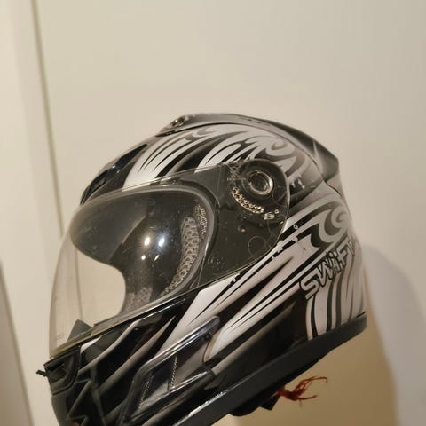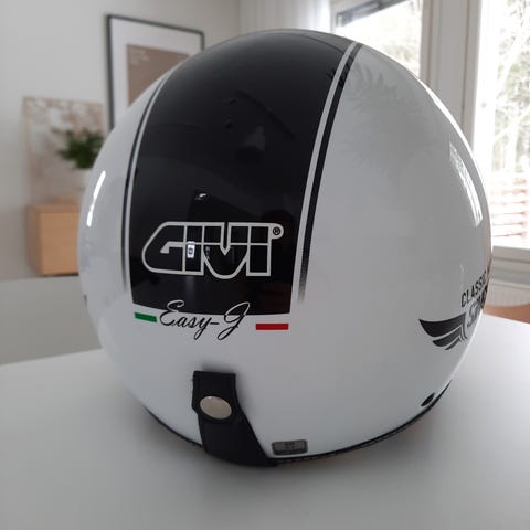 Pieneksi jäänyt kypärä ylimääräisenä.