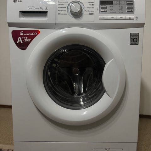 LG Edestä täytettävä pesukone, kapasiteetti 7 kg, valkoinen väri. Varustettu inverter Direct Drive -moottorilla ja 6 Motion DD -pesuteknologialla. Pesukoneessa on useita pesuohjelmia, kuten puuvilla, urheiluvaatteet, hienopesu ja pikapesu (30 min). Normaalit pesuohjelmat (30-60 astetta) kestävät noin 1,5 tuntia.