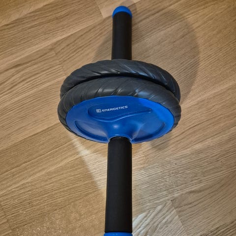 vatsalihasrulla harjoituslaite, jossa sininen väri. Laite sisältää kahvat ja liukuvat pyörät vatsalihasten harjoittamiseen. Mukana sininen polvityyny käytön mukavuuden lisäämiseksi.
