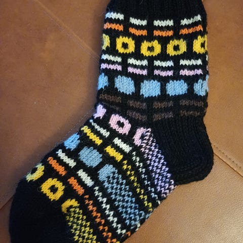 Käsin neulotut pitkävartiset villasukat.