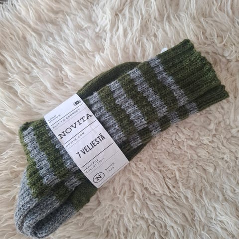 Neulottu Novitan 7-veljestä langasta. Pohjan pituus 28 cm.