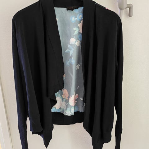 Ted Baker neuletakki, naisten koko 2 / S tai M. Valmistettu 100% puuvillasta. Jonkin verran käytetty, mutta edelleen oikein käyttökelpoinen. Olka helma noin 62 cm ja kainalo kainalo noin 44 cm.