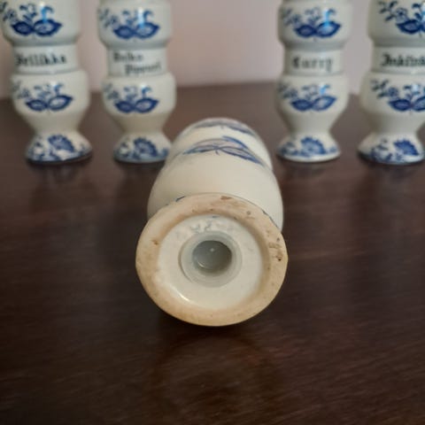Hyväkuntoinen, ajanpatiaa, pienemmässä lasipurkissa pieni naarmu, purkkien metallikansien sisäpuolella vähäistä kulumaa.