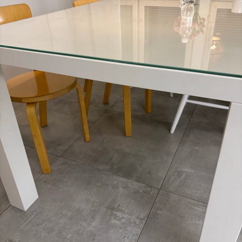 Myydään pöytälasi. Koko 90x90. Yhdessä kulmassa pieni jälki. Valkoinen pinta.