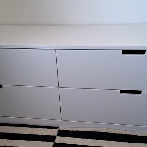 Valkoinen Ikea Nordli lipasto, jossa 6 leveää laatikkoa. Muuton yhteydessä laatikoiden yläreunoihin tullut pieniä kulumajälkiä, joita yritin saada kuviin. Yleisilmeeltään mielestäni kuitenkin oikein siisti.