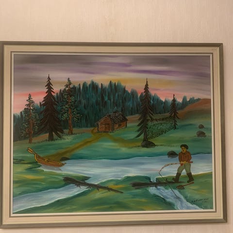 Maisemamaalaus, jossa näkyy vene järvellä ja puu rannalla. Maalaus on kehystetty koristeellisella kehyksellä. Värit ovat pääasiassa sinisen, vihreän ja ruskean sävyjä. Maalausta ei ole signeerattu. Maalaus on tehty vaneerille.