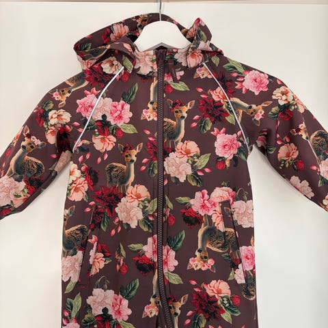 Todella siisti, yhdellä lapsella ollut käytössä. Väri vaaleanpunainen. Haalari on softshell joten pitää tuulta ja sadetta hyvin.