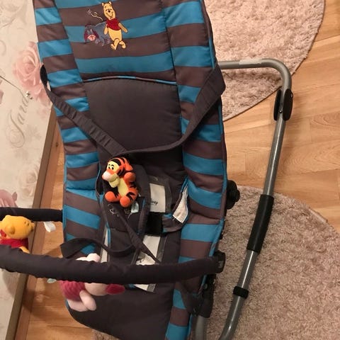 Disney Nalle Puh sitteri musta väri. Keinu on pehmustettu ja varustettu leluilla, jotka on kiinnitetty kaareen. Saa säädettyä asentoa.