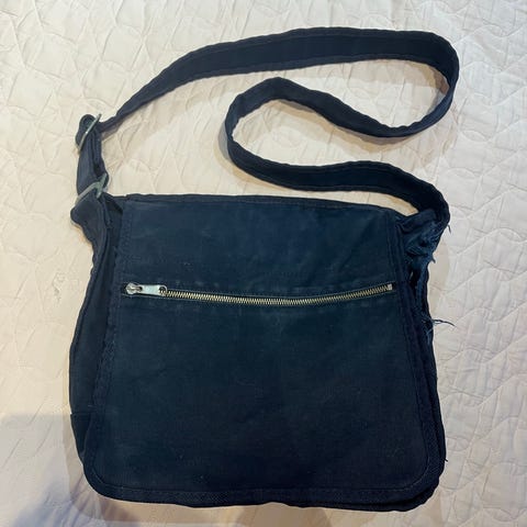 Siisti, musta olkalaukku. Pieniä kulumisen jälkiä mustassa kankaassa mutta yleisilme siisti ja hyväkuntoinen. Muovitasku ehjä.