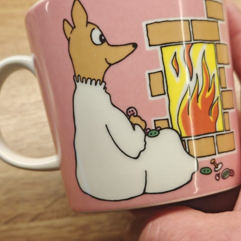 Arabia Muumi muki, posliinia. Mukissa on Muumi-aiheinen kuvitus, jossa hahmot istuvat takkatulen äärellä ja morsiuspuvussa. Mukin väri on vaaleanpunainen ulkopuolelta ja valkoinen sisältä.