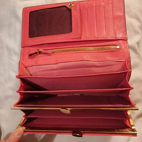 Versace nahkainen naisten kukkaro, jossa on tikattu pinta ja kultainen Medusa-logo. Kukkarossa on vetoketjullinen osio ja avainlenkki, sopii pienten esineiden säilytykseen. Kulumaa on mutta yleisesti vielä suht siisti . Vetoketju on vielä jämäkkä.