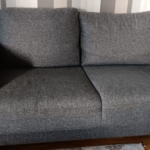 Harmaa kangasvuodesohva, jossa on irrotettava tyyny ja suora selkänoja. Sohva soveltuu istumiseen ja vuoteeksi muuntamiseen. Väri harmaa, materiaali kangas.