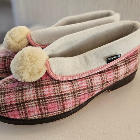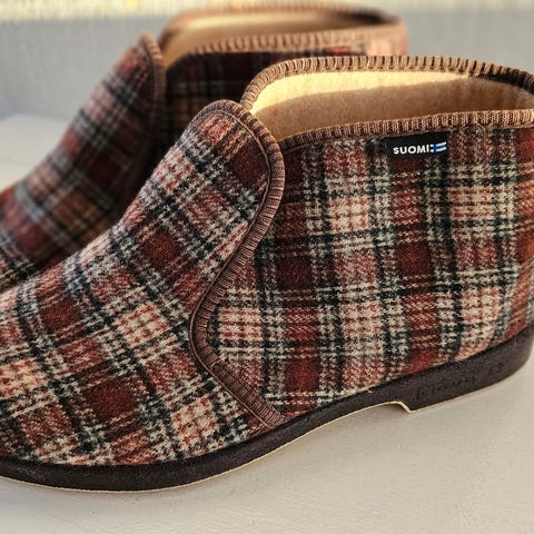 Aidot kokokonaan kotimaiset Reino tossut koossa 41. Jonkin verran käytetty, pientä nukkaa sisäpuolella vuoressa, hiven kulumaa kannassa ulkopohjassa. Yleisilme mainio.