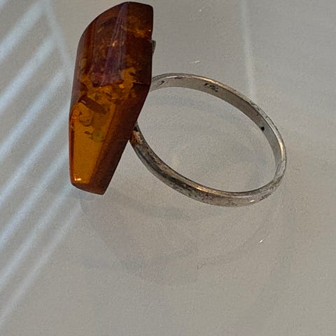 Sormus on erittäin hyvässä kunnossa. Kivi muistuttaa meripihkaa.