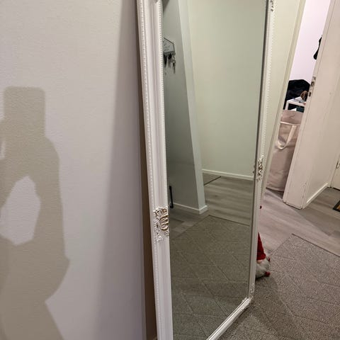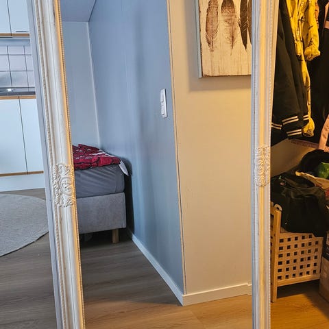 Jysk koristepeili hopeanvärinen. Peilin kehys on koristeltu ja siinä on hopeanvärinen viimeistely.