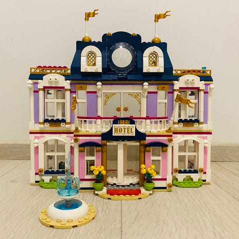 Lego friends grand hotelli osat osittain koottuna. Ohjeet löytyy netistä koodilla 41101 Lego. Ihan kaikki palat rakenteisiin ei välttämättä tallella ja saattaa vaatia lisä paloja. Laitan niitä pakettiin mukaan muista paketeista.