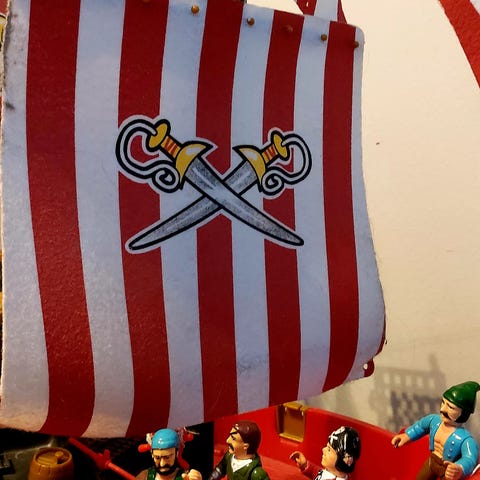 Merirosvolaiva leikkisetti sisältää kaksi laivaa, joissa hahmot mukana. Paljon leikitty. Yhteensä 10€. Nouto.
