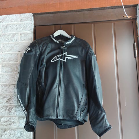 Ylimääräisenä kuvien takki. Nahkainen. Hyvät taskut. Laadukas. Selässä vetoketju housujen liittämiseen.