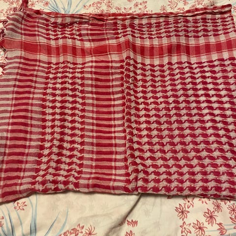 Ympyrän muotoon tehty kaulaliina, luonnonvalkoista neulosta.