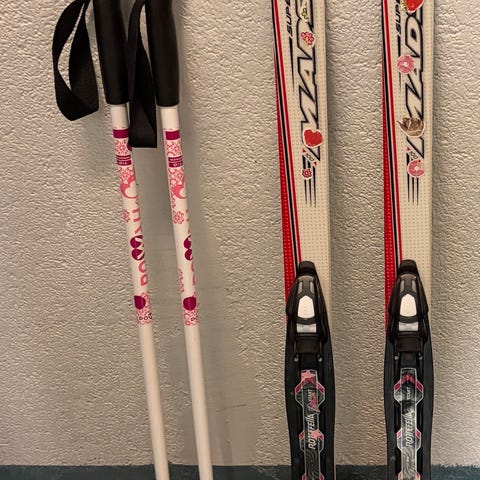 Lasten 100cm hiihtosukset siteillä ja 80 cm sauvoilla.