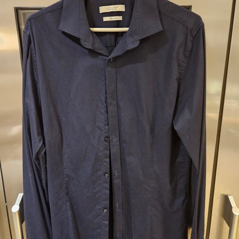 Jack & Jones Premium musta kauluspaita. Koko merkintä 42/L, mutta on pienempi ja arvioin n. M kokoa. Varmasti sopiva n. 175 cm hoikalle.