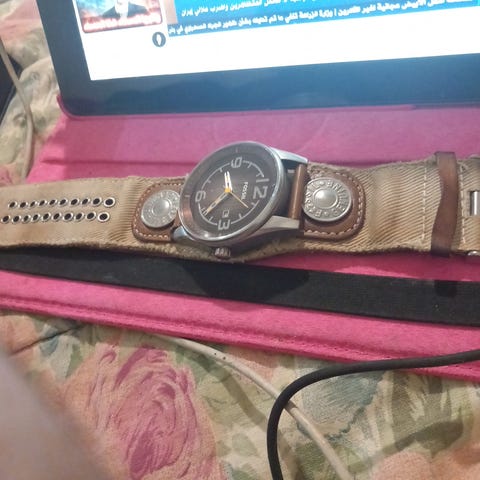 Fossil miesten rannekello, jossa on nahkainen leveä ranneke. Kello on varustettu mustalla kellotaululla, jossa on selkeät numerot. Rannekkeen nahka on ruskea ja siinä on koristeellisia yksityiskohtia. Kellon mukana tulee alkuperäinen Fossil-merkkinen säilytyslaatikko.