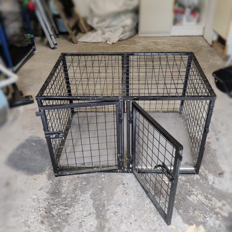 Metallinen koirankoppi, musta väri. Kopissa on kaksi ovea ja irrotettava alusta, joka helpottaa puhtaanapitoa. Sopii koirien kuljetukseen tai lepopaikaksi.