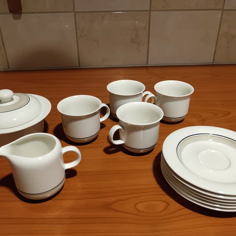 Raija Uosikkinen 60-luku. Kaunis muotoilu. Iso ruokailu astiasto. Muuten ehjä mutta reunojen kultaukset kuluneet. Yhdessä vuokassa liimattu nurkka, siitä kuva. Vain nouto. 2 kastikekulhoa, 2 isoa soppakulhoa kansineen, iso tarjoilulautanen halkaisija 31 cm, 5 kpl eri kokoisia soikeita tarjoilulautasia, 3 kpl soikeita kulhoja, 12 kpl pieniä lautasia, 11 kpl keskikokoisia lautasia, 12 kpl ruokalautasia, 12 kpl syviä lautasia,
