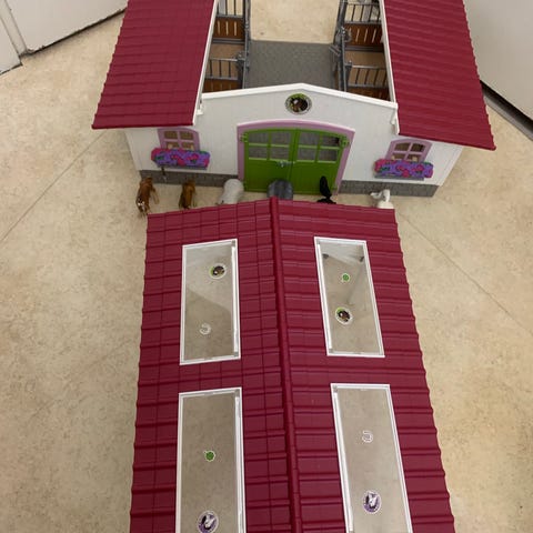 Punaisesta katoksesta mahdollisesti puuttuu pari jalkaa, mutta katoksen saa silti paikoilleen. Myös vihreää katosta voi pitää tallin kattona.