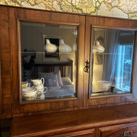 Antiikkityylinen tammivitriinikaappi, jossa yläosassa lasiovet ja alhaalla kaksi puuovea sekä vetolaatikot