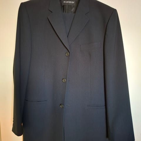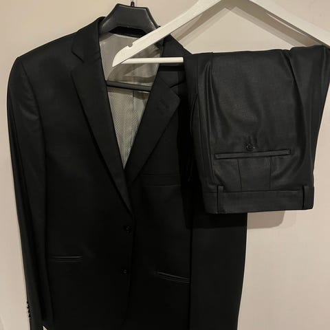 Kerran käytetty puku, takki 52 ja housut 32. Materiaali polyesteria, viskoosia ja elastaania.