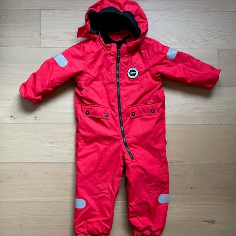 Haalarissa pieni kosmeettinen virhe: Reima-logosta on revitty pois kaksi kirjainta, “R” ja “E” (päiväkotikaverin toimesta). Tämä ei vaikuta haalarin käyttöön, ja haalari on edelleen ehjä ja siisti.
