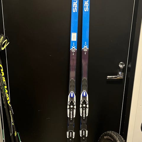 Suksien pohjissa muutamia pieniä pitkittäisiä naarmuja. Monoissa ei mukana pohjallisia.