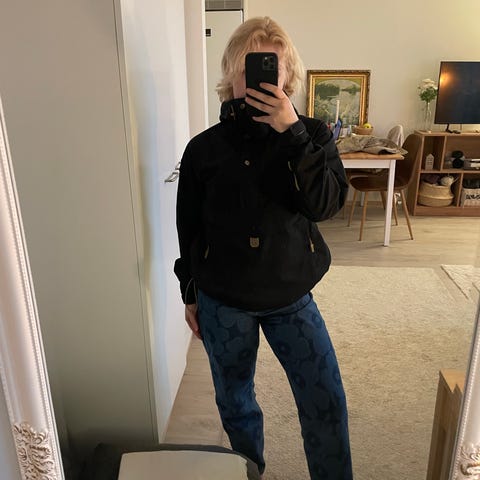 Vanha ja kulunut mutta ehjä. Retkeilyvaatteille tyypillistä puuvillapolyesterisekoitekangasta. Ohut, pakkautuu pieneen tilaan.