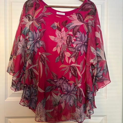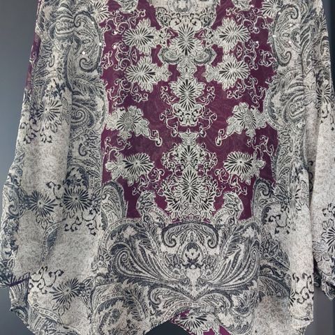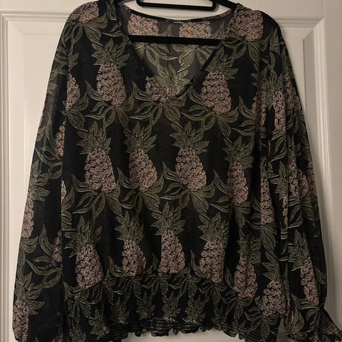 Musta perhoshihainen uudenveroinen sifonkipusero. Hihoissa, olalla ja kaula-aukossa metallikoristeet. Sisällä toppi, solmittava vyötärönauha. Koko XL.