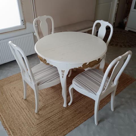 Myyntiin tulossa ok kuntoinen ruokailuryhmä. Pöytä ja neljä tuolia. Ryhmä on alunperin ollut 6 hengen ryhmä. ( tuoleja neljä nyt ) Vain nouto ja omat kantajat mukaan. Noudon ajankohta sovittava erikseen. Lemmikkitalous