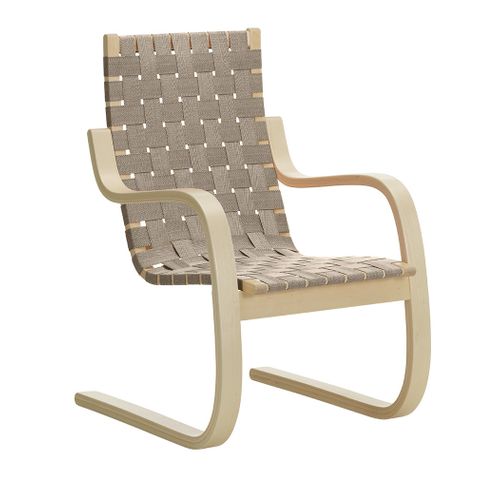 Artekin nojatuoli beige satulavyö. Tuolissa on jonkin verran käytönjälkiä. Tuoli on alkuperäisessä kunnossa talttapää ruuveilla.
