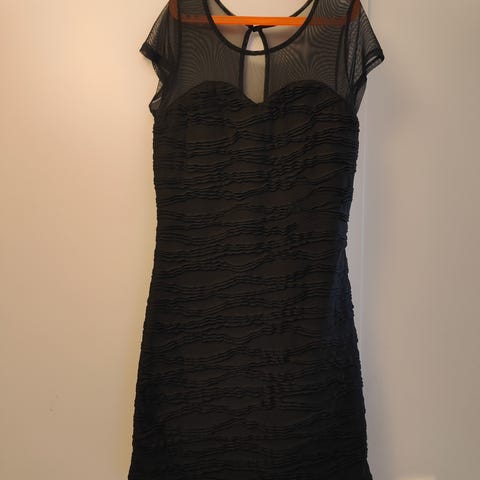 Zizzi 23-Party musta mekko, koko M, vastaa n 44-46 kokoa. Materiaalina 90% polyesteriä, 10% elastaania. Pääliosa läpikuultavaa sifonkia, alla trikoovuori. Siistikuntoinen. Rinnanympärys 118 cm, joustaa lähes 130 senttiin. Olka-helma 100 cm.