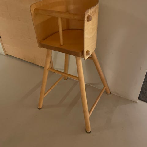 Artek syöttötuoli, jossa on puinen istuinosa ja valkoinen selkänoja.