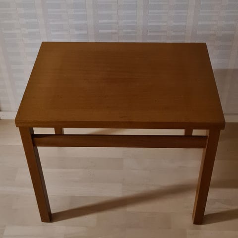 Musta pikkupöytä pyörillä ja alasolla. Pinnassa kulumaa ja ollut alunperinkin musta, ei itsemaalattu. Ollut meillä kukkapöytänä.