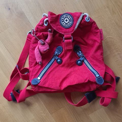 Tummansininen reppu, jossa värikäs apinaprintti. Mitat: korkeus 45 cm, leveys 35 cm, syvyys 19 cm. Edessä kaksi vetoketjutaskua. Yläosassa pieni tasku esim. avaimille, nenäliinoille tms. Sisällä päälokeron lisäksi kaksi taskua, joista toinen tarralla suljettava esim. läppäriä varten.