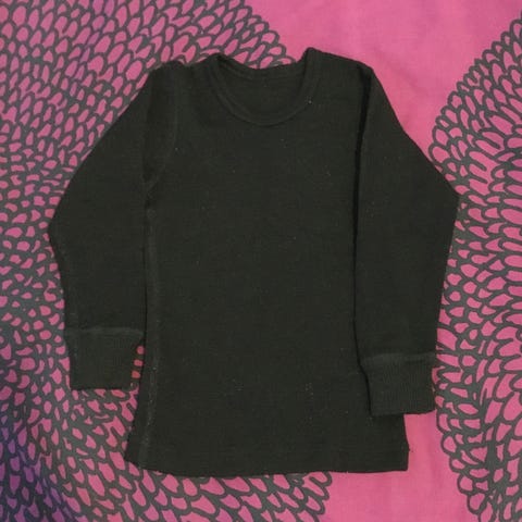 Ruskovilla lasten yöpuku / unipussi, koko 90. 100% luomumerinovillaa. Parissa kohdassa reiänalut, yksi reikä hihassa (kuva). Eivät ole lähteneet purkautumaan isommiksi, ei ole siten yritetty paikata.