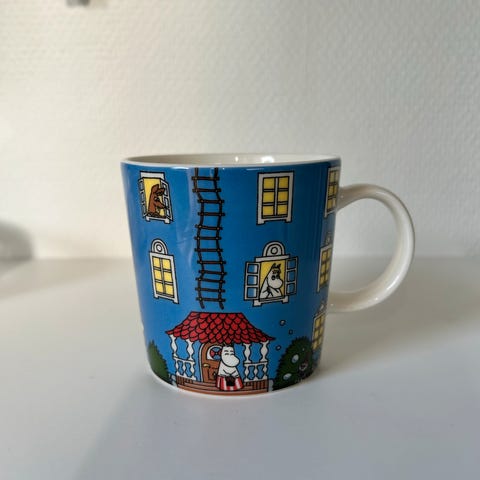 Paljon käytössä olleet kaksi muumitalo muumimukia.