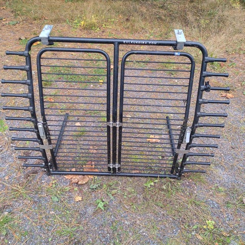 Karmin väliin asennettava tukeva koiraportti. Putkien väli 10cm ja alaosassa varmistuksena vielä vihreää aitaverkkoa. K 1700mm L 750mm. Lukitus riippulukolla. Kaksi saranaa.