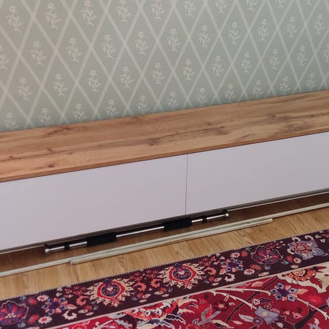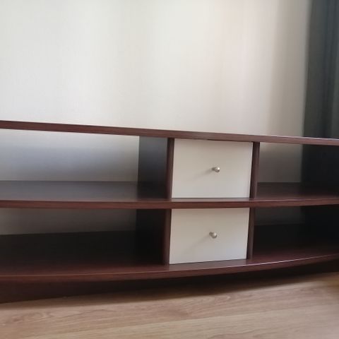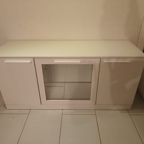 Myydään valkoinen tv-taso tarpeettomana. Kaksi kaappia molemminpuolin. Yleisilmeeltään siisti. Pieniä käytönjälkiä tason takareunassa siitä kuva.