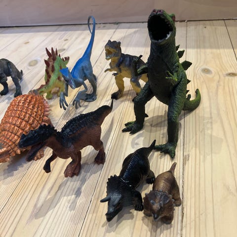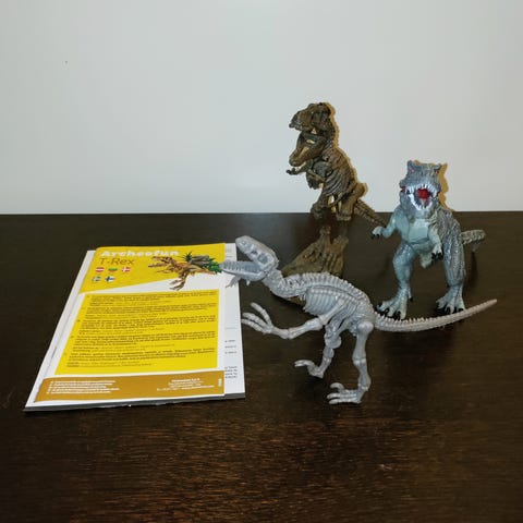 Tästä seuraavaan kotiin rakkaudella keräilty setti. Isoin punainen T-rex (tms) karjuu kun sitä painaa hännästä.