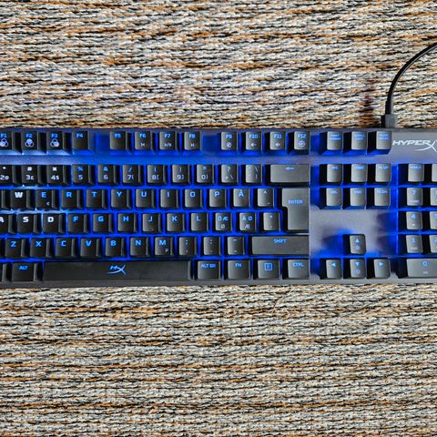 HyperX Alloy FPS Pro näppäimistö, jossa on punaiset mekaaniset kytkimet. Musta väri ja langallinen USB-liitäntä. Soveltuu pelaamiseen ja kirjoittamiseen.
