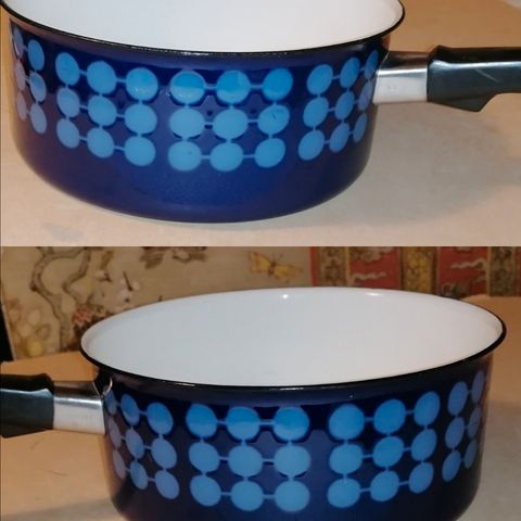Esteri Tomulan Finelille suunnittelema Domino-emalimuki 0,25 l. Mukin korkeus 7,8 cm ja halkaisija 7,5 cm.