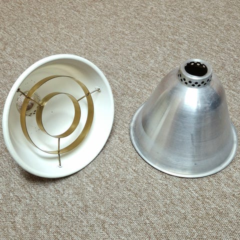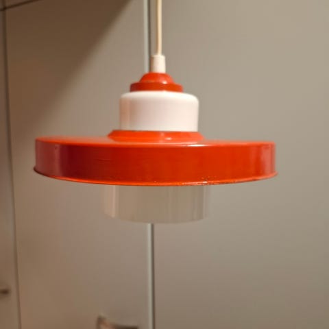 Toinen valaisin hyvässä kunnossa ja toinen kohtalaisessa kunnossa. Kupu halkaisija 26 cm, korkeus noin 20 cm. Mielellään haku.