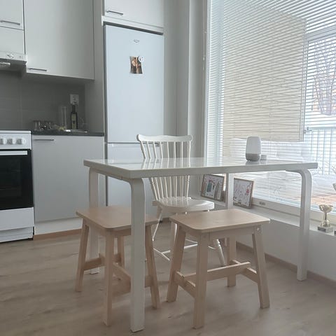 Pöytä on lähes uudenveroinen ja vuodelta 2020. Laminaattipinnassa on hentoja hiusjälkiä ja jaloissa pari kevyttä naarmua. Yleisilme on täysin uuden veroinen.